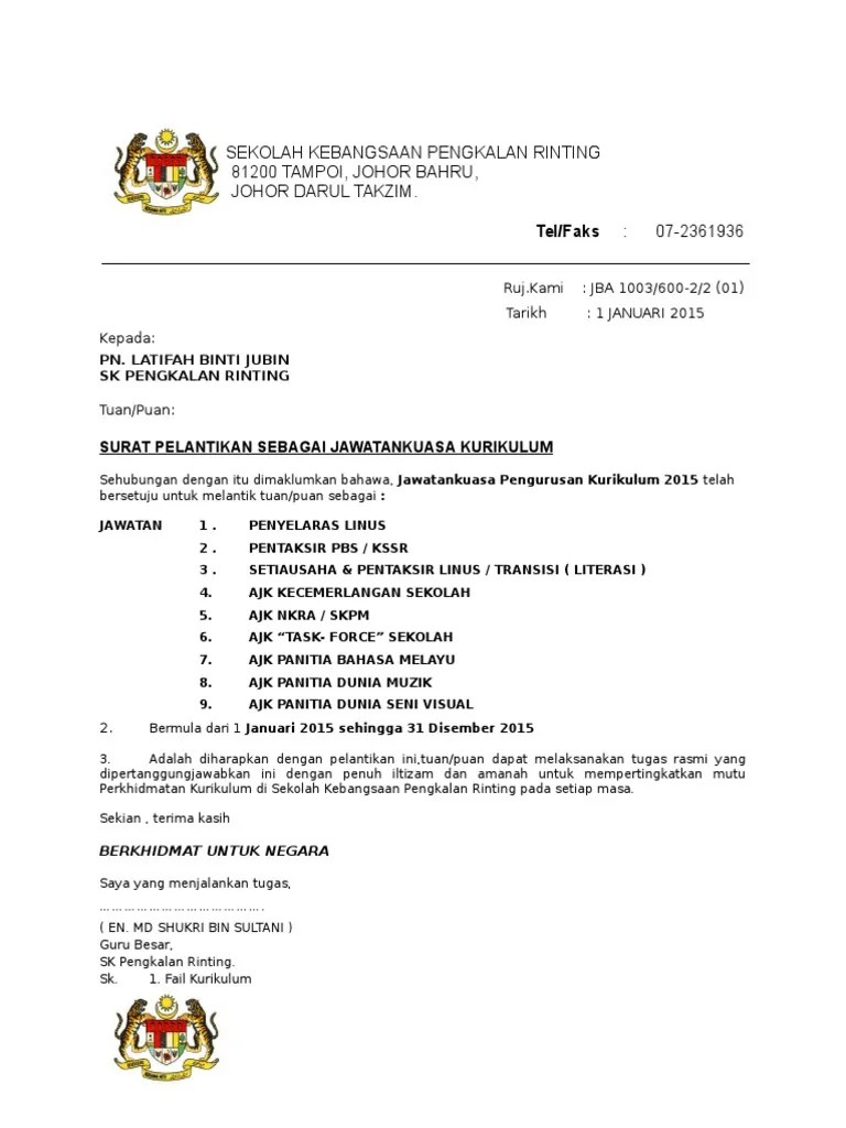 Sjk t ladang jendarata 3 contoh surat pelantikan juruaudit dalaman. Bukti atau butiran yang mengesahkan jawatan anda di sesebuah syarikat atau organisasi? Contoh surat tolak tawaran latihan industri . Contoh surat lantikan kerja surat perlantikan kps mohcetakbaju com contoh surat lamaran kerja di perusahaan . Contoh surat pelantikan jawatan di syarikat. Contoh surat pelantikan jawatan di syarikat.